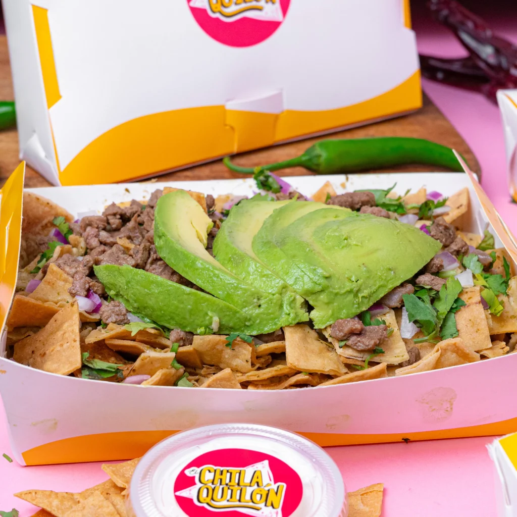Medio litro de chilaquiles con nuestra salsa rojona con un toque de chipotle, coronada con top sirloin en cubos, queso derretido y una buena porción de aguacate con su cilantro y cebolla. lleva su crema a parte.
