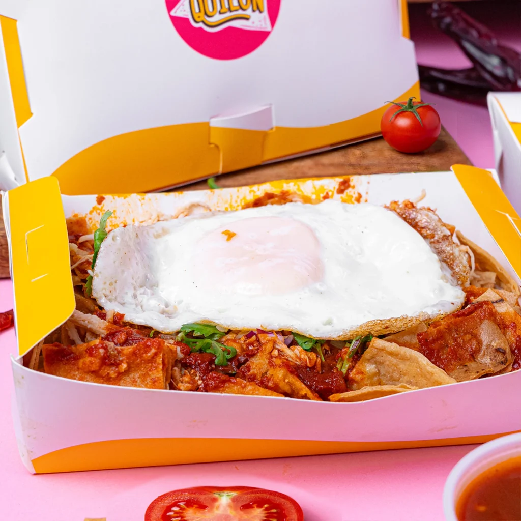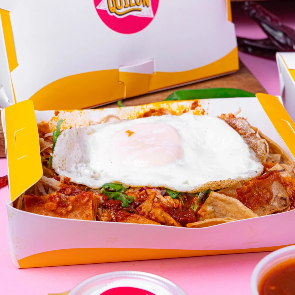 Medio litro de chilaquiles con nuestra salsa rojona con un toque de chipotle, coronada con huevito, queso derretido, su cilantro, cebolla. lleva su crema a parte.
