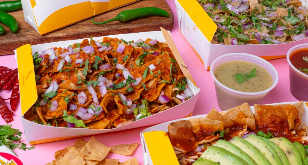 Medio litro de chilaquiles con nuestra salsa rojona con un toque de chipotle, cilantro, cebolla y su crema a parte.