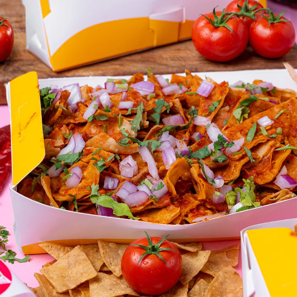 Medio litro de chilaquiles con nuestra salsa tomatera (de la que no pica), cilantro, cebolla y su crema a parte.