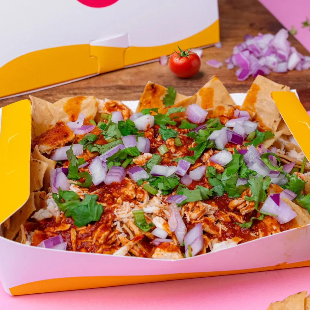 Medio litro de chilaquiles con nuestra salsa rojona con un toque de chipotle, coronada con pollo, aguacate, queso derretido, su cilantro, cebolla. lleva su crema a parte.