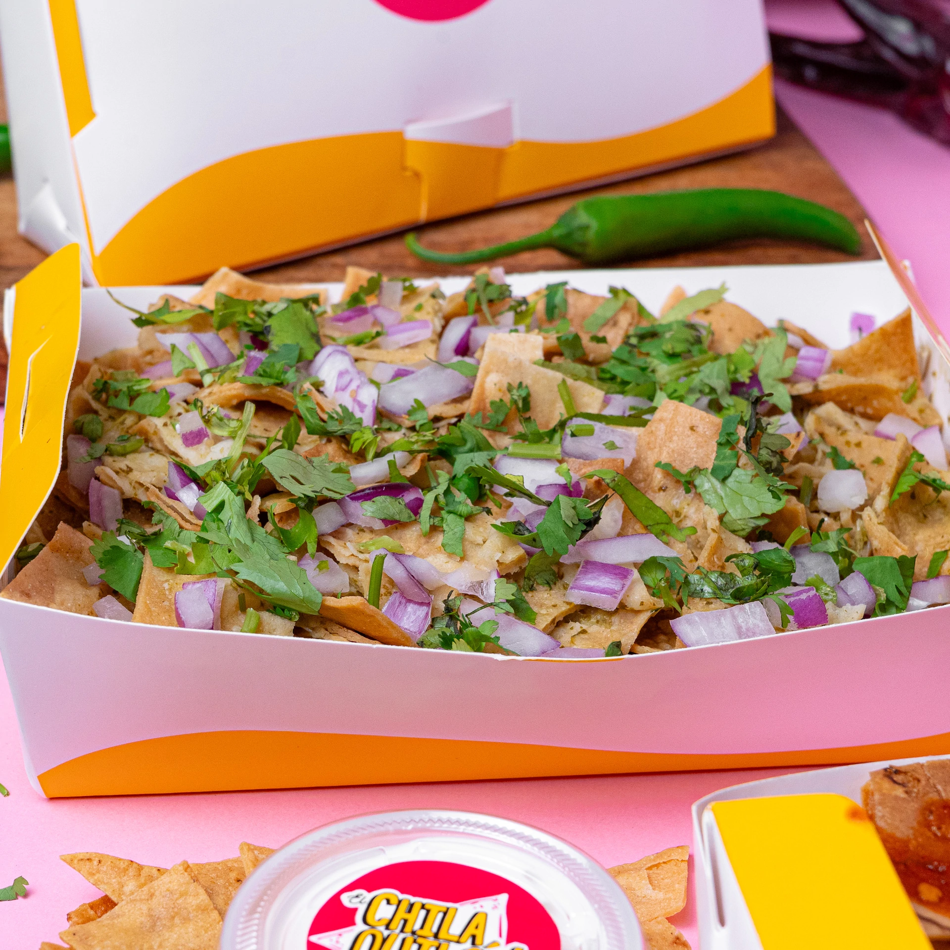 Medio litro de chilaquiles con nuestra salsa a la verde picosita, con su cilantro, cebolla. lleva su crema a parte.