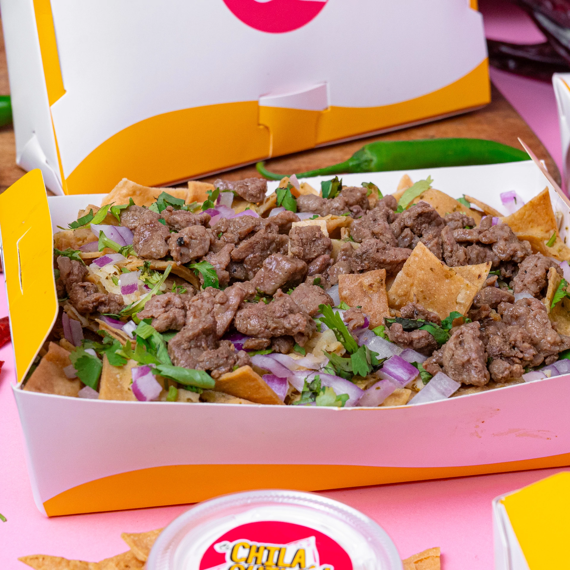 Medio litro de chilaquiles con nuestra salsa a la verde picosita, coronada con top sirloin en cubos, queso derretido, su cilantro, cebolla. lleva su crema a parte.