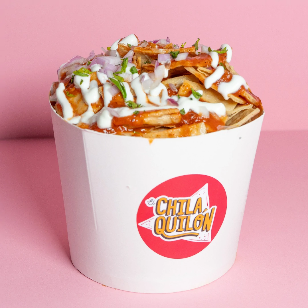 Medio litro de chilaquiles con nuestra salsa rojona con un toque de chipotle, cilantro, cebolla y su crema a parte.